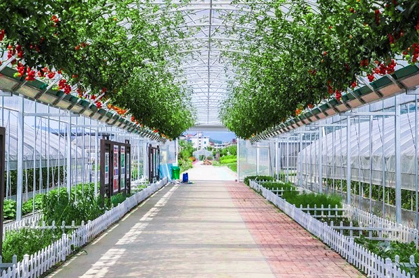 番茄長廊,番茄被種在了空中,你擔心澆水施肥嗎?不用怕,一鍵可以搞定。在番茄棚下面埋著長長的水管,澆水施肥通過管道就可以實現!