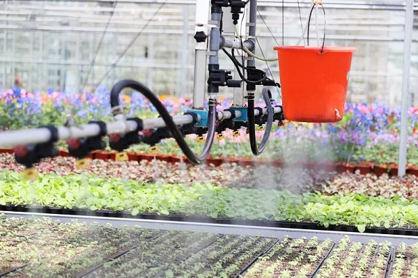 灌溉系統,在大棚里正在培育夏季的蔬菜秧苗。幼苗很金貴,噴灑式灌溉既平均又方便!