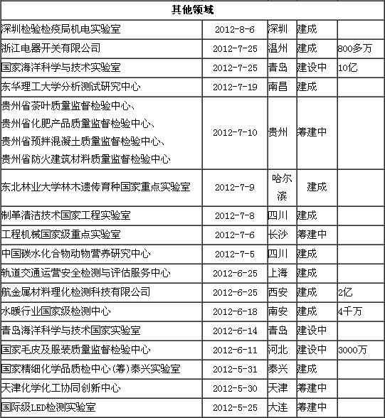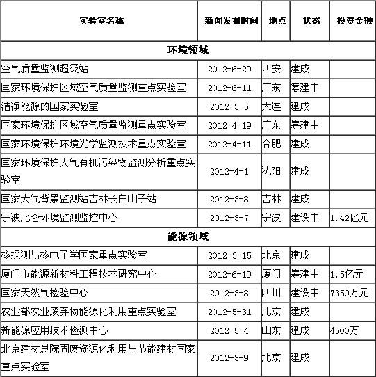 在這四十五家的實驗室中,糧油儀器網發現有多家制造商廠商斥巨資設立研發中心,以下為2012年上半年我國環境、能源及其他領域的實驗室建設情況: